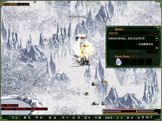 从雪山一路杀到雪堡4层,终于采集完样本,回去找研究员交付任务。